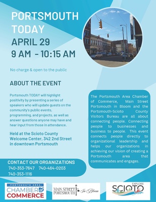 Portsmouth TODAY – highlighting positivity by presenting a series of speakers who will update guests on the community’s public events and projects, answer questions, and hear input from those in attendance. Event takes place at the Scioto County Welcome Center, 342 2nd Street, in downtown Portsmouth. It’s free and open to the public – begins at 9 am. Brought to you by the Portsmouth-Scioto County Visitors Bureau, Main Street Portsmouth in Bloom and the Portsmouth Area Chamber of Commerce. Call 740-353-7647 for more information.